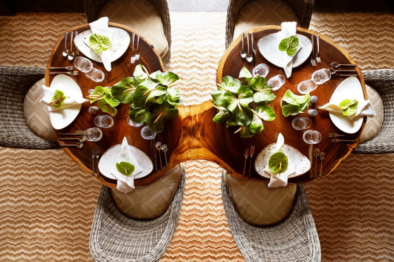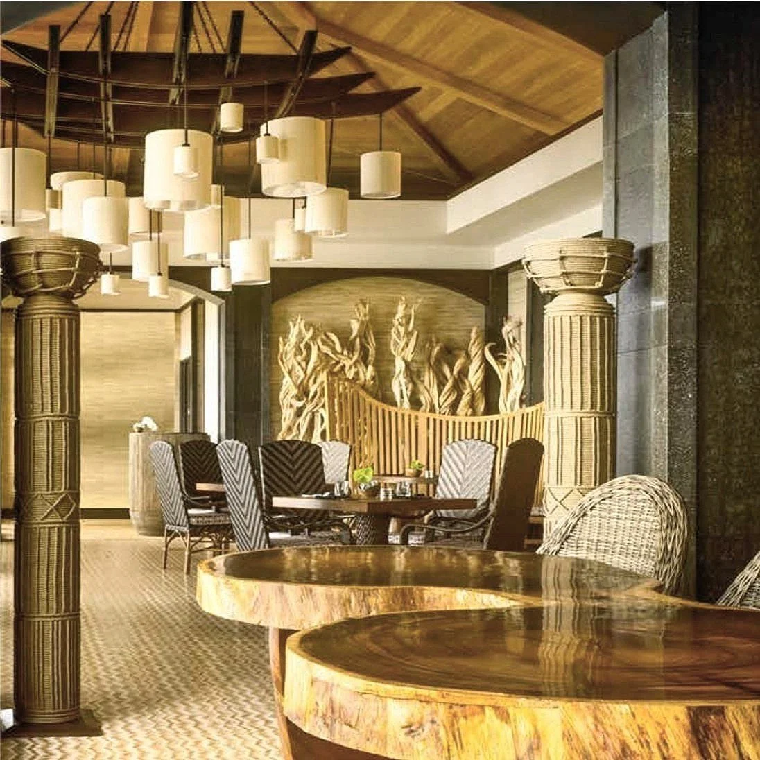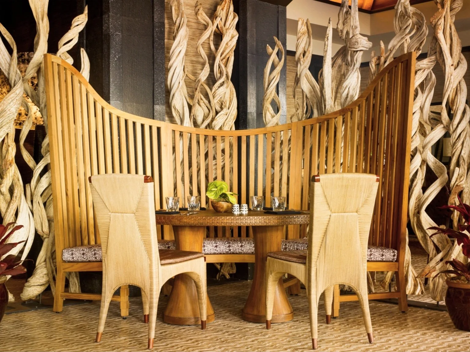 Perched on a bluff overlooking the Pacific at Manele Bay, VIEWS restaurant was designed to celebrate the raw beauty of Lana‘i’s southern coastline. The open-air layout captures panoramic ocean views, with a direct view of the legendary Puu Pehe—Sweetheart Rock—anchoring the horizon. A geometric mosaic floor, inspired by traditional Hawaiian motifs, grounds the space, while vertical slats of natural wood—reminiscent of driftwood carried ashore—serve as both textured backdrop and screening element. The design balances bold architectural gestures with natural materials to create a space that feels grounded, site-specific, and quietly dramatic—reflecting the unique spirit of the island.